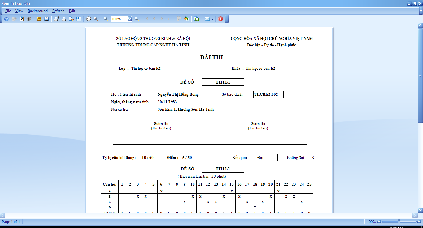 Giám thị/ cán bộ coi thi có thể in trực tiếp bài làm của thí sinh từ phần mềm quản trị phòng thi trắc nghiệm trực tuyến này. Đây chính là giấy làm bài của thí sinh, có phần làm bài, phần đáp án, và kết quả bài thi. Thí sinh sẽ ký xác nhận nộp bài vào tờ giấy này.