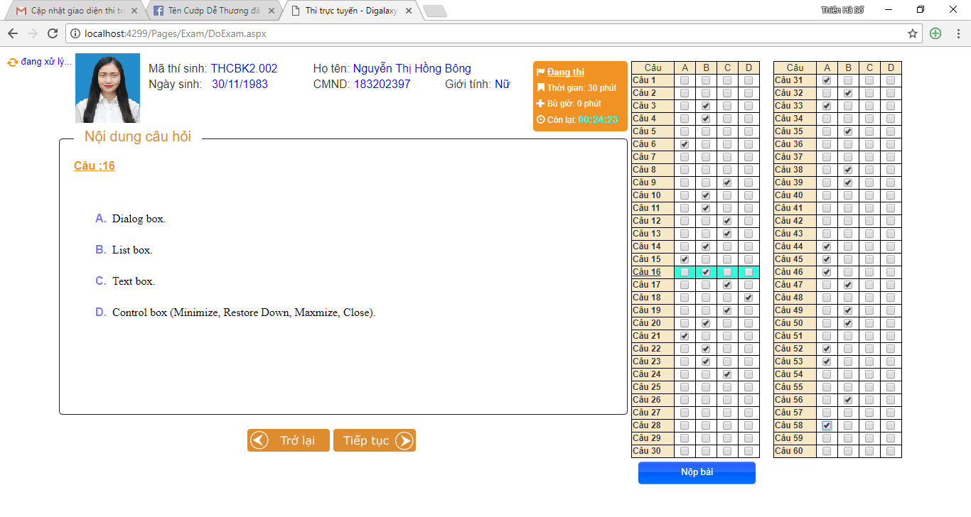 Màn hình làm bài của thí sinh được chèn hình ảnh để giám thị dễ theo dõi, phát hiện trường hợp thi hộ. Đồng hồ đếm ngược được thiết kế mỹ thuật và tường minh hơn.