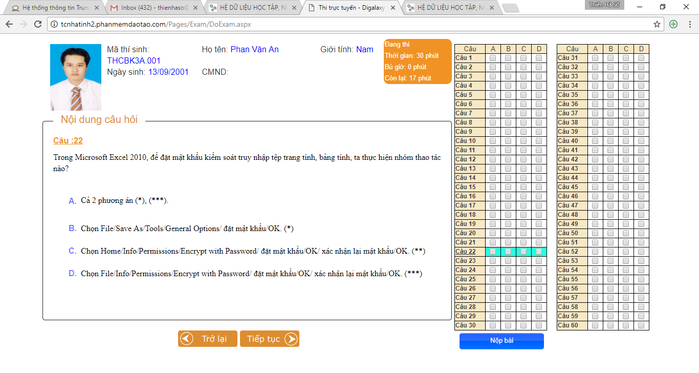 Một số màn hình thi trắc nghiệm trực tuyến: